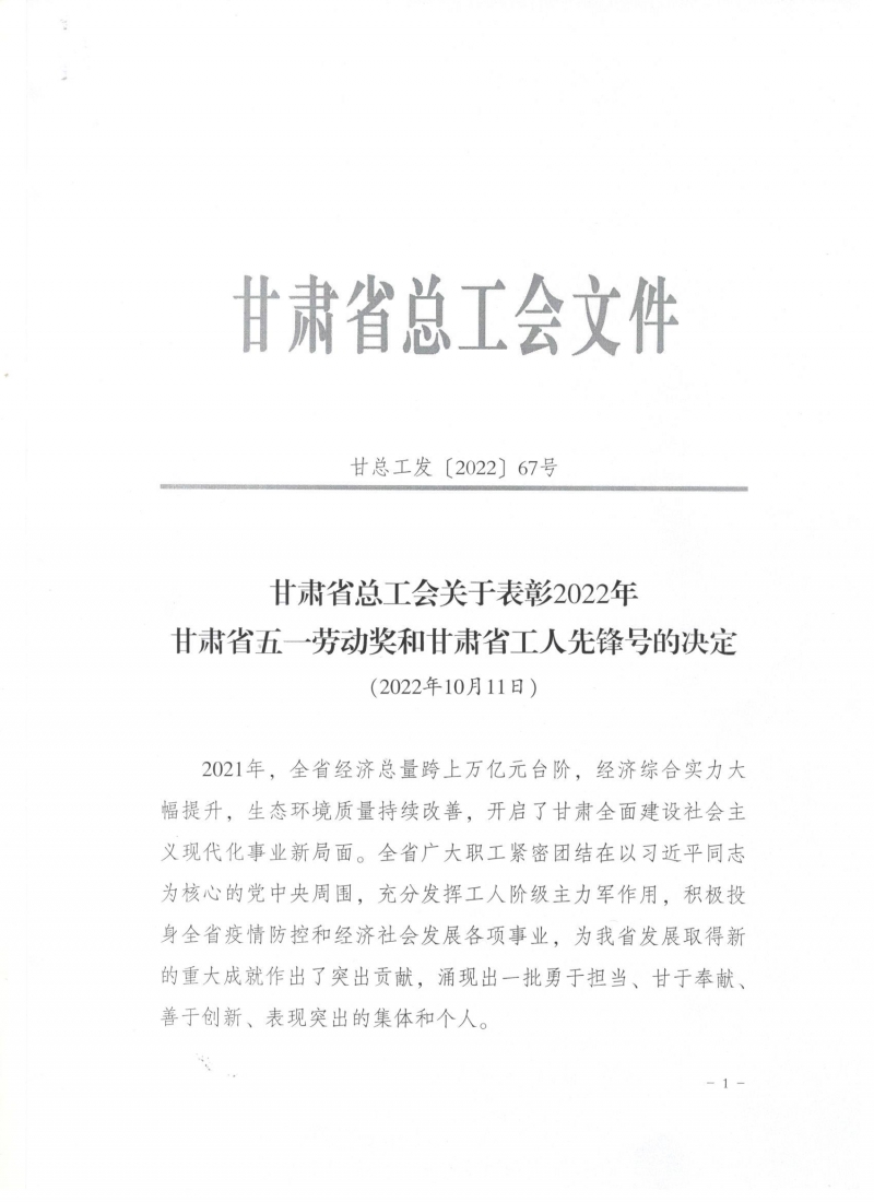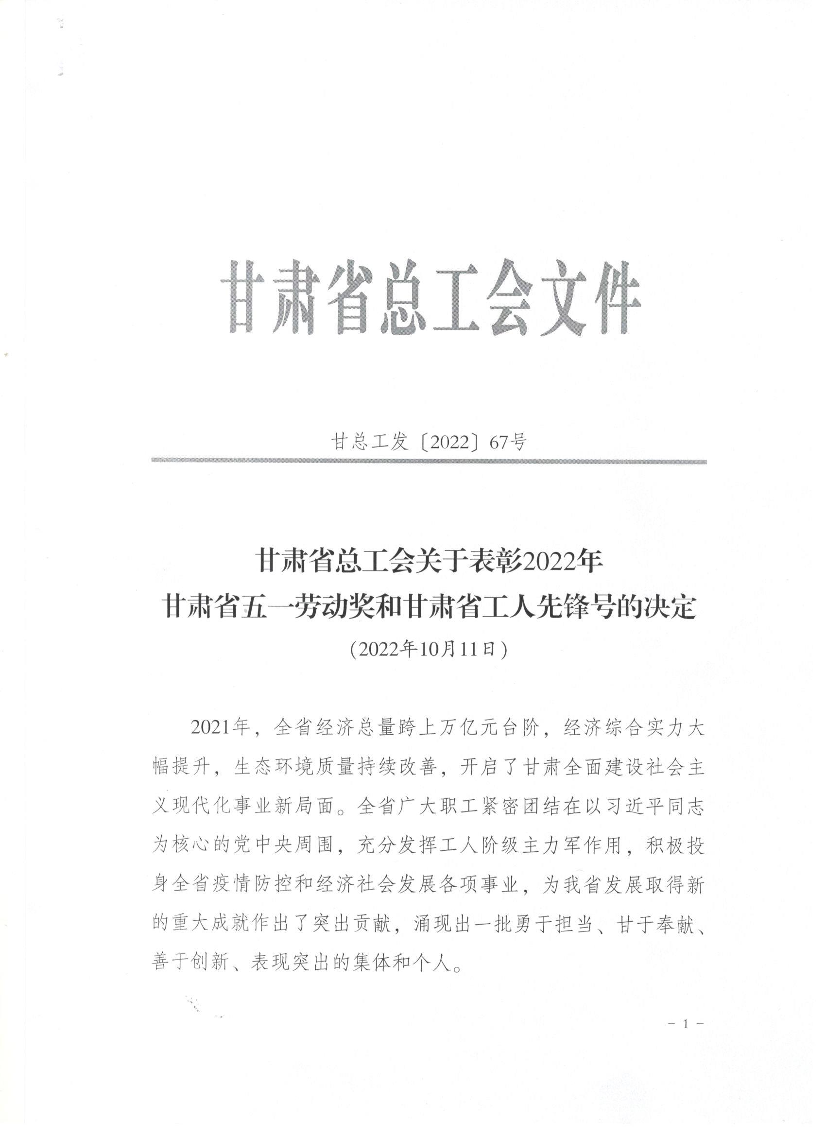 近日,甘肅省總工會發布了《關于表彰2022年甘肅省五一勞動獎和甘肅省工人先鋒號的決定》,我司被授予“甘肅省五一勞動獎”和“甘肅省工人先鋒號”。