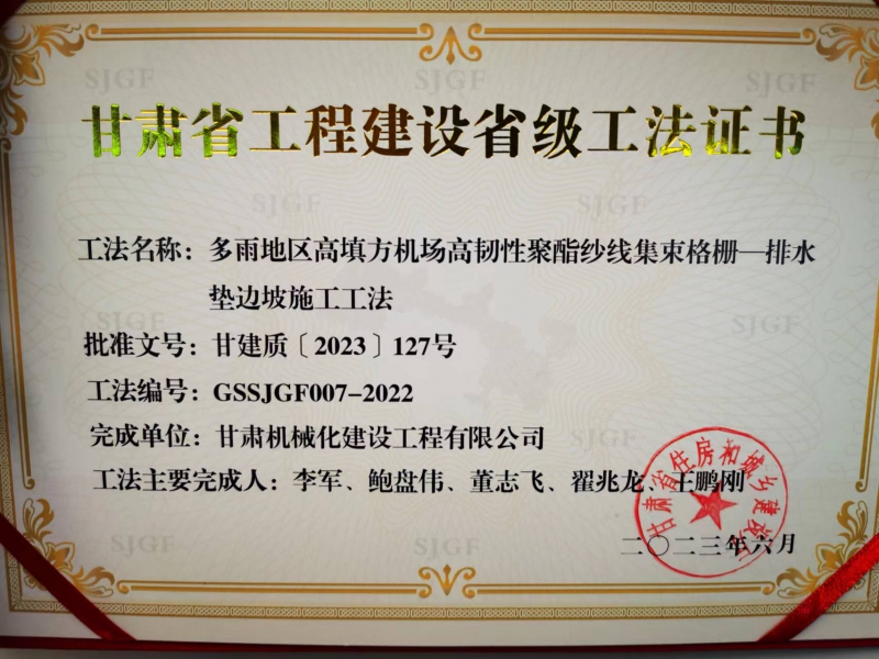近年來,我司不斷加強(qiáng)技術(shù)創(chuàng)新和精品工程創(chuàng)建,科技創(chuàng)新能力和工藝水平再上新臺(tái)階。在承建的麗水機(jī)場土石方工程02標(biāo)段中,面對多雨地區(qū)高填方施工中的重難點(diǎn),公司專門組建了科研和施工小組,通過大量現(xiàn)場工藝實(shí)踐、工藝改善,提煉出項(xiàng)目重難點(diǎn)的關(guān)鍵技術(shù)。2023年6月,獲得了“多雨地區(qū)高填方機(jī)場高韌性聚酯紗線集束格柵—排水墊邊坡施工工法”。