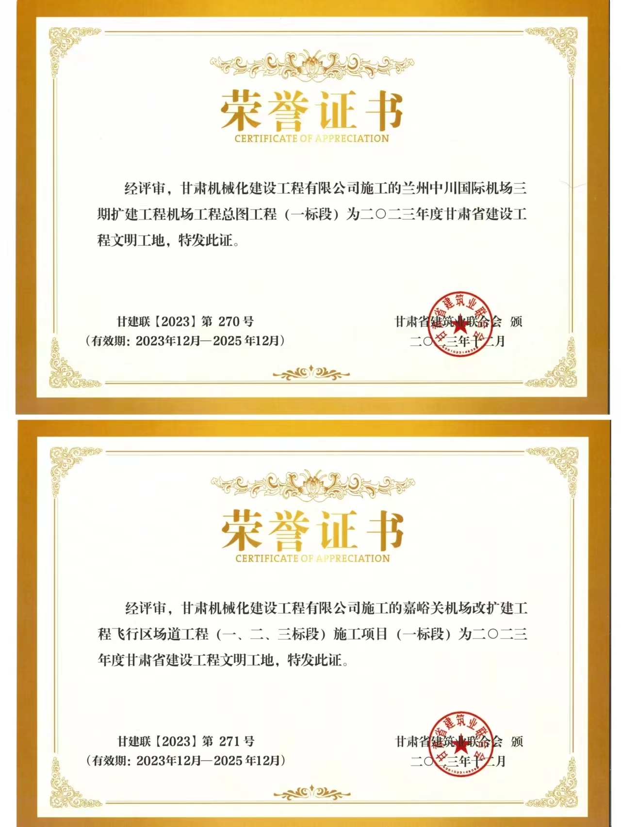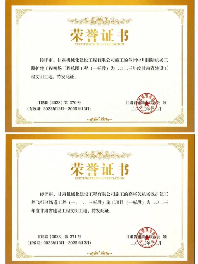 近日,我司承建的蘭州中川國際機(jī)場二期擴(kuò)建工程機(jī)場工程總圖工程 (一標(biāo)段)與嘉峪關(guān)機(jī)場改擴(kuò)建工飛行區(qū)場道(一、二、三標(biāo)段) 施工項目 (一標(biāo)段) 獲得2023年度甘肅省建設(shè)工程文明工地榮譽(yù)稱號。